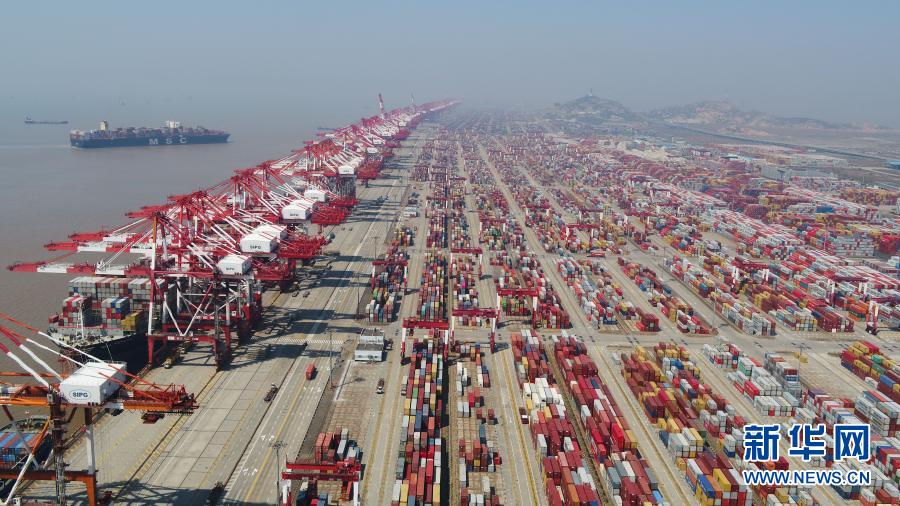 这是2020年3月18日拍摄的上海洋山港集装箱码头(无人机照片)。新华社记者 丁汀 摄