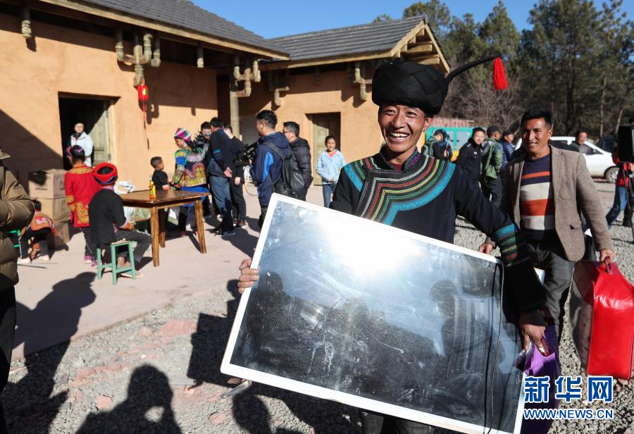 在四川省昭觉县三河村的易地扶贫安置点,彝族群众马海日聪喜搬新居(2019年2月11日摄)。2019年2月11日,位于大凉山腹地的四川省昭觉县三河村首批29户、168人告别居住多年的土坯房,搬入易地扶贫安置点的新家。新华社记者 江宏景 摄