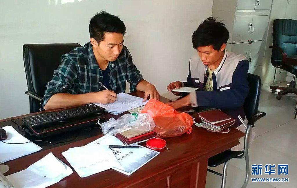 蒋富安(左)在核对贫困户信息台账(资料照片)。新华社发