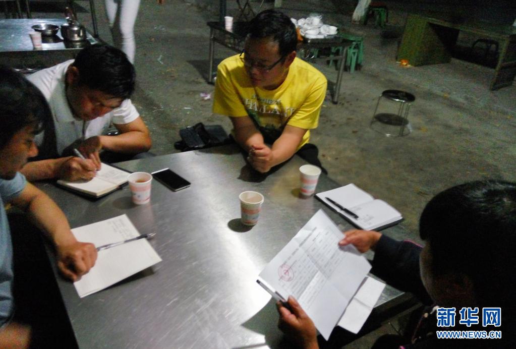 吴国良(右二)与扶贫干部交流工作进展(资料照片)。新华社发