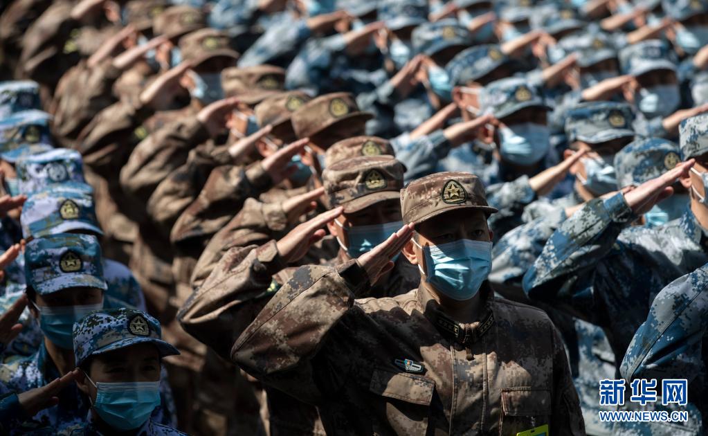 2020年4月15日,最后一批回撤的军队支援湖北医疗队队员向火神山医院敬礼告别。新华社记者 费茂华 摄