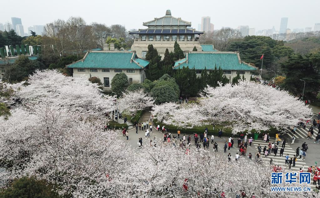 3月13日,武汉大学抗疫医护人员赏樱专场启动,来自全国各地的援鄂抗疫英雄在樱花树下重逢,尽享樱花之约(无人机照片)。新华社记者 程敏 摄