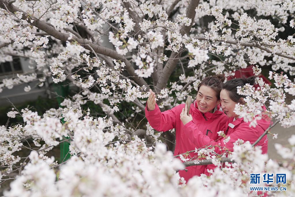 3月13日,武汉雷神山医院医护人员在樱花树下赏花。当日,武汉大学抗疫医护人员赏樱专场启动,来自全国各地的援鄂抗疫英雄在樱花树下重逢,尽享樱花之约。新华社记者 熊琦 摄