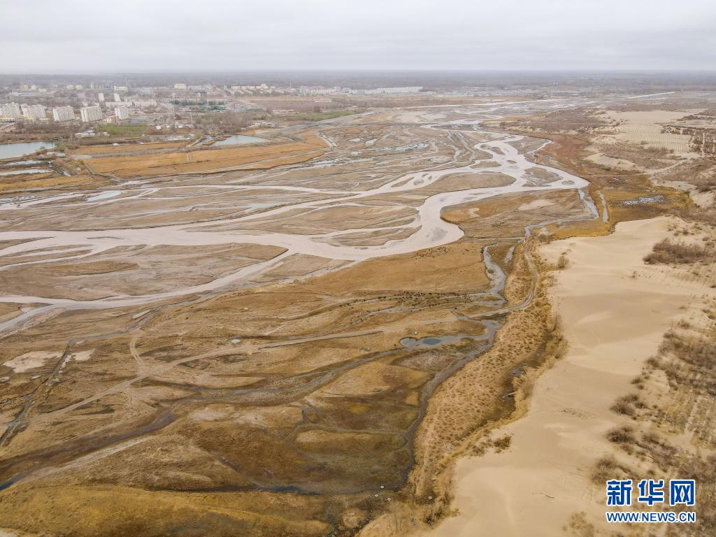 新疆且末县城与塔克拉玛干沙漠之间隔着车尔臣河(3月31日摄,无人机照片)。新华社记者高晗摄