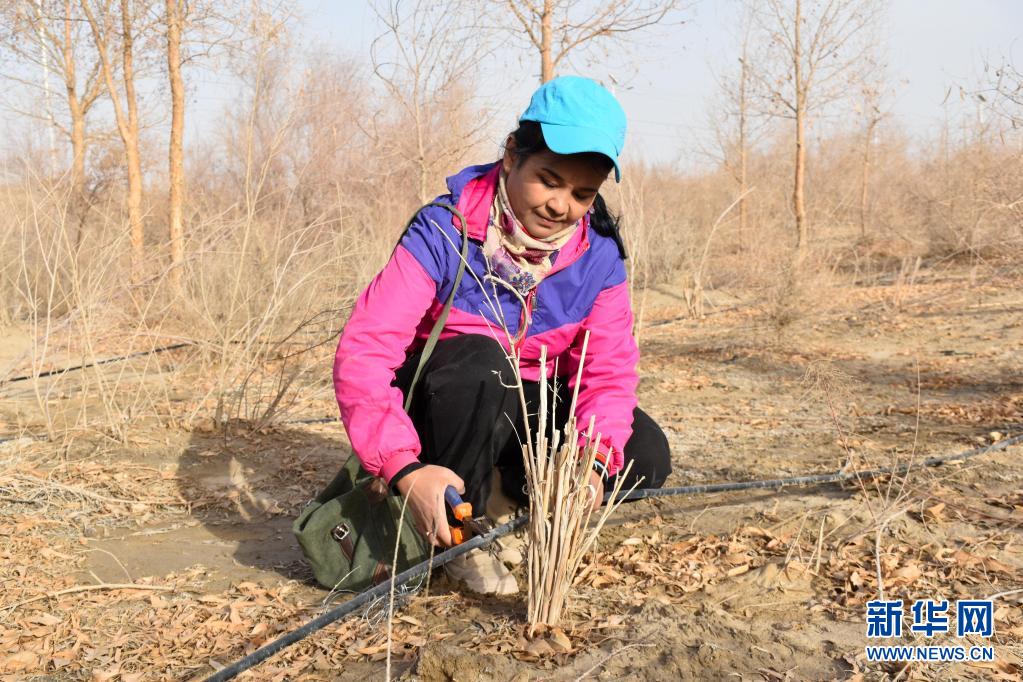 新疆且末县河东治沙站员工帕提古丽·亚森在检查梭梭林滴灌带(4月1日摄)。新华社记者高晗摄