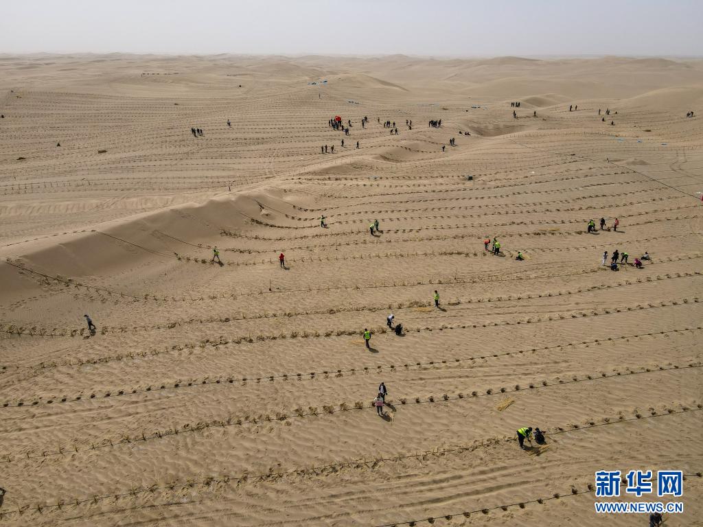 人们在距离新疆且末县城不远处的塔克拉玛干沙漠内植树(3月28日摄,无人机照片)。新华社记者高晗摄