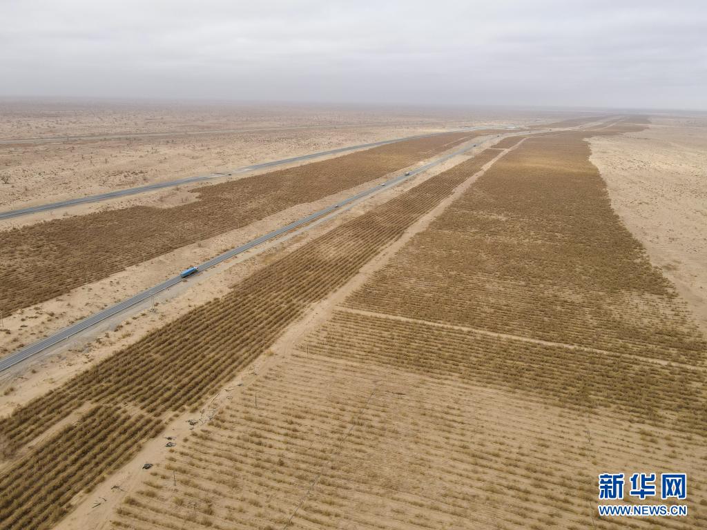 这是新疆且末县国道旁种植的生态梭梭林(3月31日摄,无人机照片)。新华社记者高晗摄