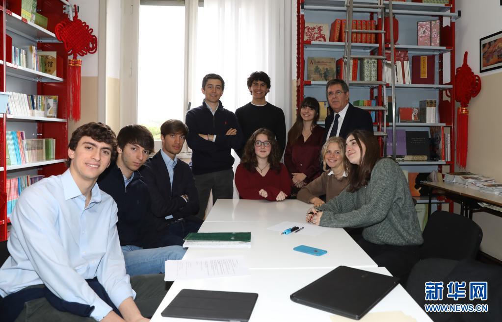 意大利罗马国立住读学校校长雷亚莱(后排右一)与致信习近平主席的学生们在一起(2019年3月18日摄)。新华社记者程婷婷摄