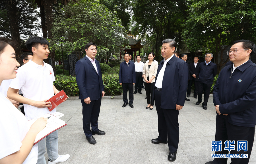5月14日上午,中共中央总书记、国家主席、中央军委主席习近平在河南省南阳市主持召开推进南水北调后续工程高质量发展座谈会并发表重要讲话。这是座谈会前,习近平于12日在南阳市考察东汉医学家张仲景的墓祠纪念地医圣祠时,同正在参观的学生亲切交流。新华社记者鞠鹏摄