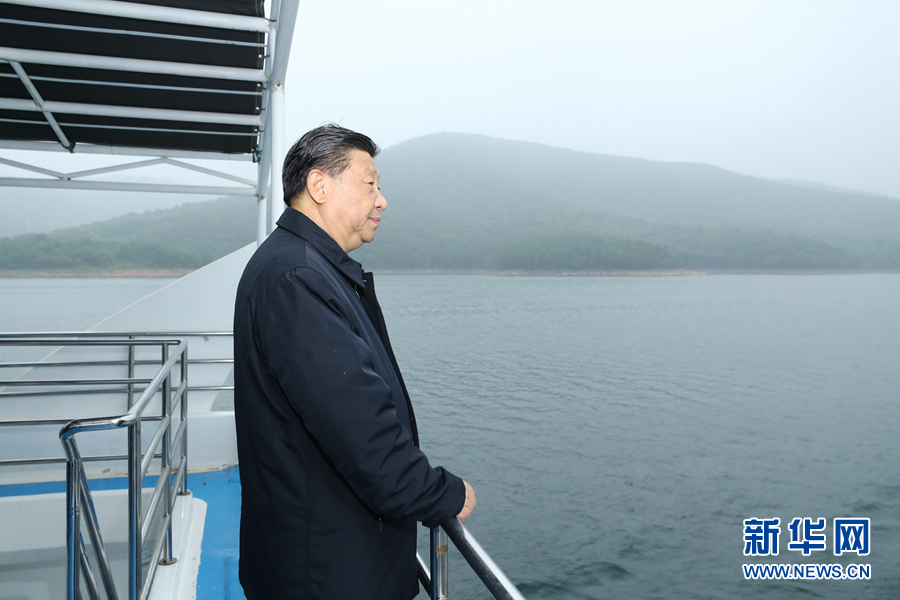 5月14日上午,中共中央总书记、国家主席、中央军委主席习近平在河南省南阳市主持召开推进南水北调后续工程高质量发展座谈会并发表重要讲话。这是座谈会前,习近平于13日在南阳市淅川县乘船考察丹江口水库。新华社记者王晔摄