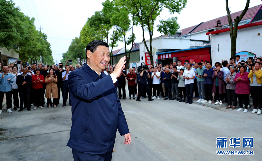 5月14日上午,中共中央总书记、国家主席、中央军委主席习近平在河南省南阳市主持召开推进南水北调后续工程高质量发展座谈会并发表重要讲话。这是座谈会前,习近平于13日在南阳市淅川县九重镇邹庄村考察时,向村民挥手致意。新华社记者鞠鹏摄