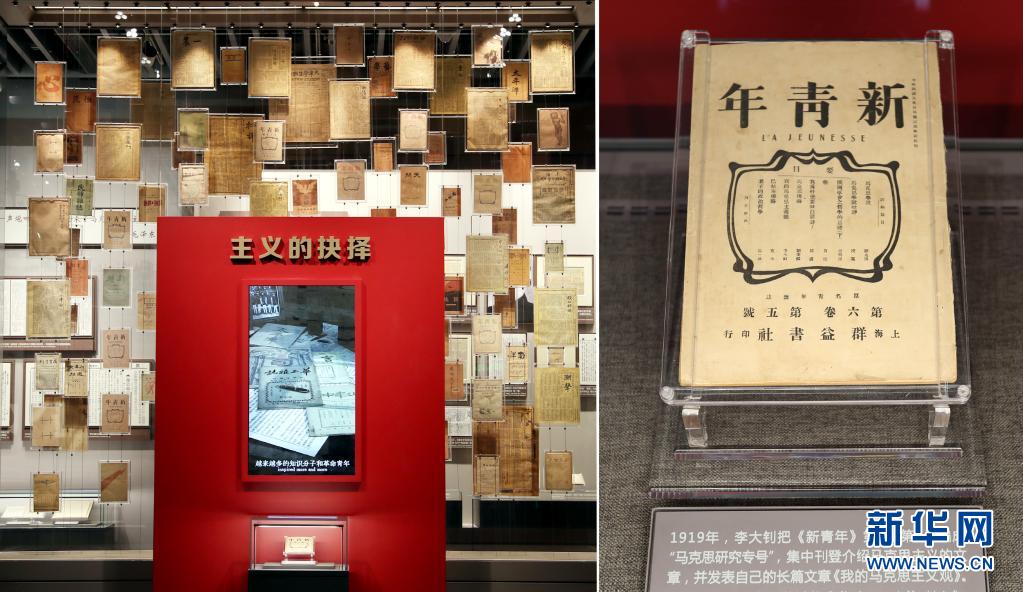 大型立体式视觉置景名为“主义的抉择”,100件五四运动前后传播马克思主义、社会主义的报纸杂志,错落陈列在玻璃墙上。其中,《新青年》第6卷第5号“马克思研究专号”在前端“高光”展示,这期“专号”标志着马克思主义在中国的传播进入了较为系统的阶段(6月1日摄)。新华社记者 刘颖 摄