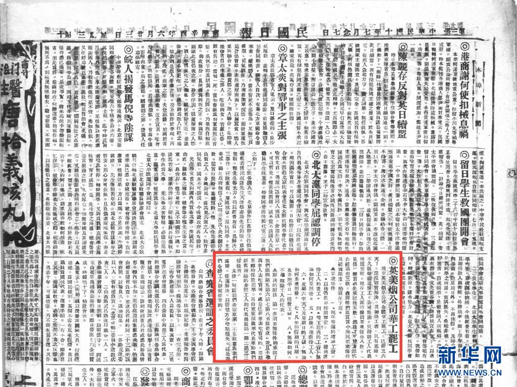 1921年7月27日的《民国日报》上登载了上海浦东英美烟草公司华工罢工的消息。新华社发(上海图书馆提供)
