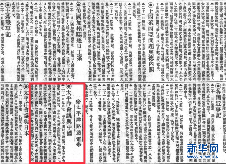 1921年7月23日《申报》上的消息《太平洋会议与中国》。新华社发(上海图书馆提供)